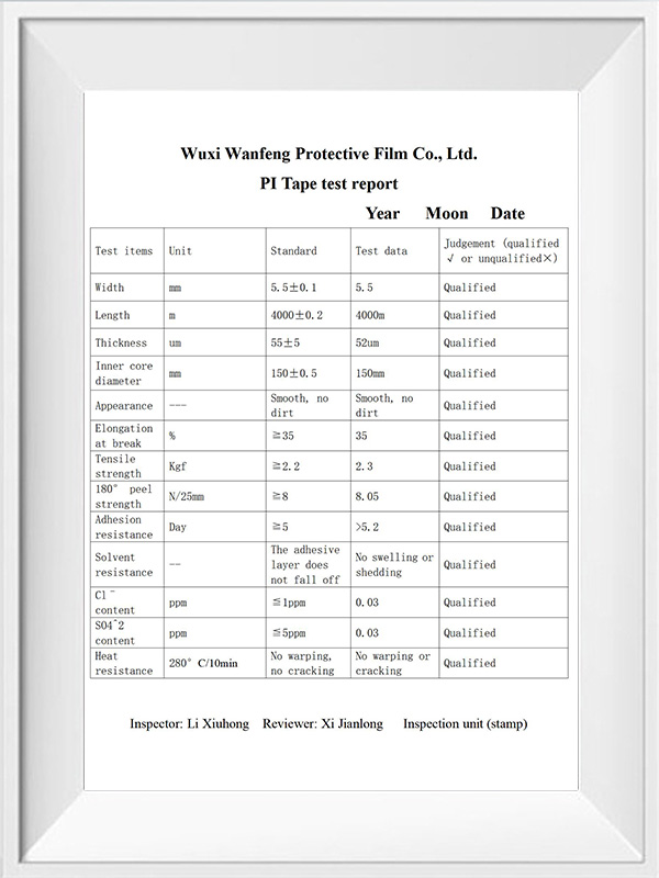 المقاومة الكيميائية: يُظهر شريط PI المقاوم للحرارة مقاومة كيميائية ملحوظة، وهو أمر بالغ الأهمية للتطبيقات في البيئات التي يكون فيها التعرض للمواد الكيميائية والمذيبات والمواد القاسية الأخرى أمرًا شائعًا. مواد البوليميد مقاومة بطبيعتها لمجموعة واسعة من المواد الكيميائية، بما في ذلك الأحماض والقواعد والمذيبات العضوية. هذه الخاصية تجعل شريط PI خيارًا قيمًا للاستخدام في صناعات المعالجة الكيميائية وتصنيع الإلكترونيات والقطاعات الأخرى حيث يكون التعرض للمواد المسببة للتآكل أمرًا مثيرًا للقلق. تضمن شركة Wuxi Wanfeng Protection Film Co., Ltd. تصنيع أشرطة PI الخاصة بها لتوفير مقاومة كيميائية مثالية، وحماية المكونات والأسطح الحساسة من التلف المحتمل.